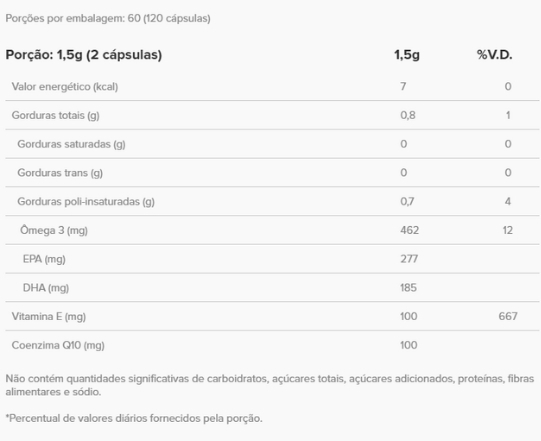 Óleo de peixe (Pronova Pure® omega-3 TG), mix de tocoferóis, coenzima Q10 (Kaneka Q10®). Composição da cápsula: gelatina, água purificada, umectante glicerina e corantes naturais carmim e curcumina.